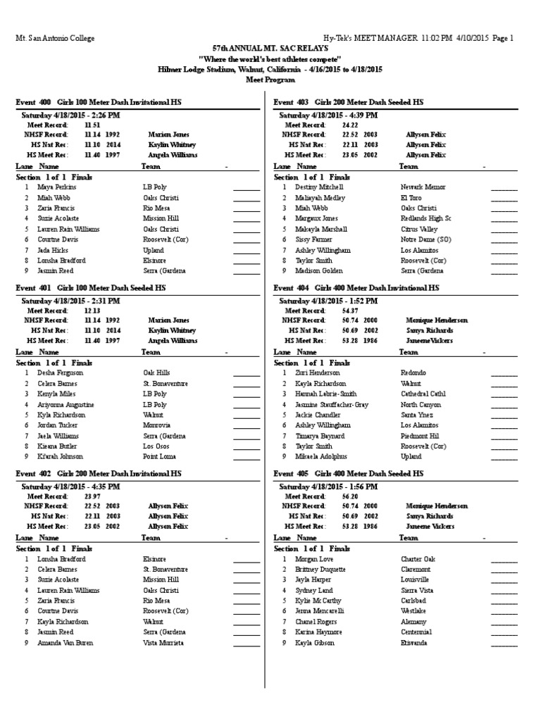 Mt Sac Relays Heat Sheets / DyeStat.com - News - Michael Norman, Rai Benjamin Only ... - San antonio college campus in walnut, california.. Popular running shoes podcast pro runner $alaries. Sac relays on april 20, 2019, including handoff involving superphenom sydney mclaughlin in the women's invitational 4x400 race at el camino college in torrance, california. 1 ranked connor ross (mcqueen the marquee event of the 2015 mt. 1965 pablo mcneil sc astros 9.4yw. 2 ranked carlton orange (memphis, tn) and u.s.